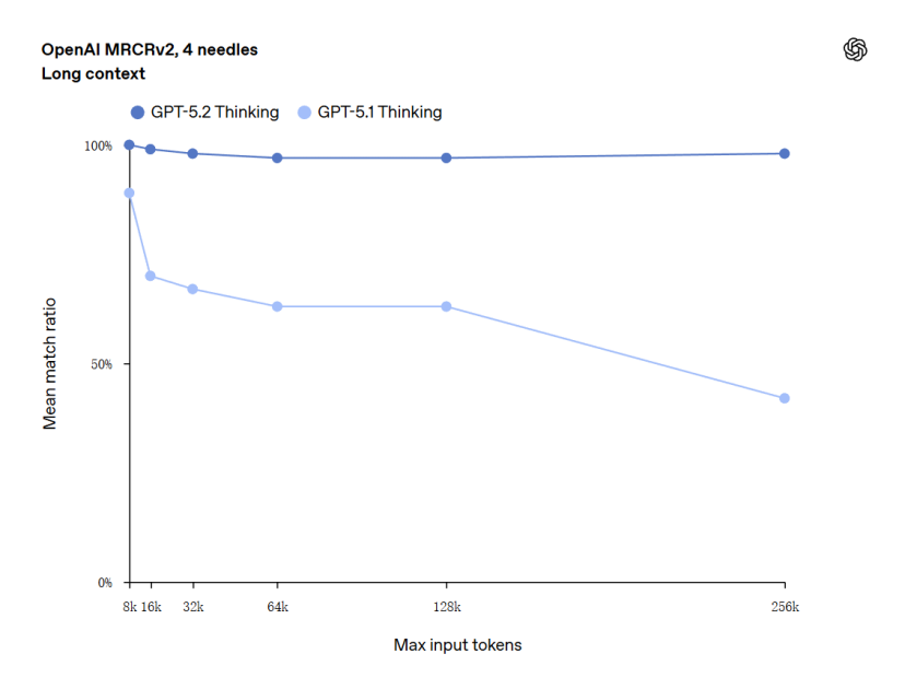 GPT-5.2在长文档长入上也有赫然越过。在OpenAI的MRCRv2测试中,它成为首个在256k token长度下,针对4-needle变体任务达到近乎100%准确率的模子。