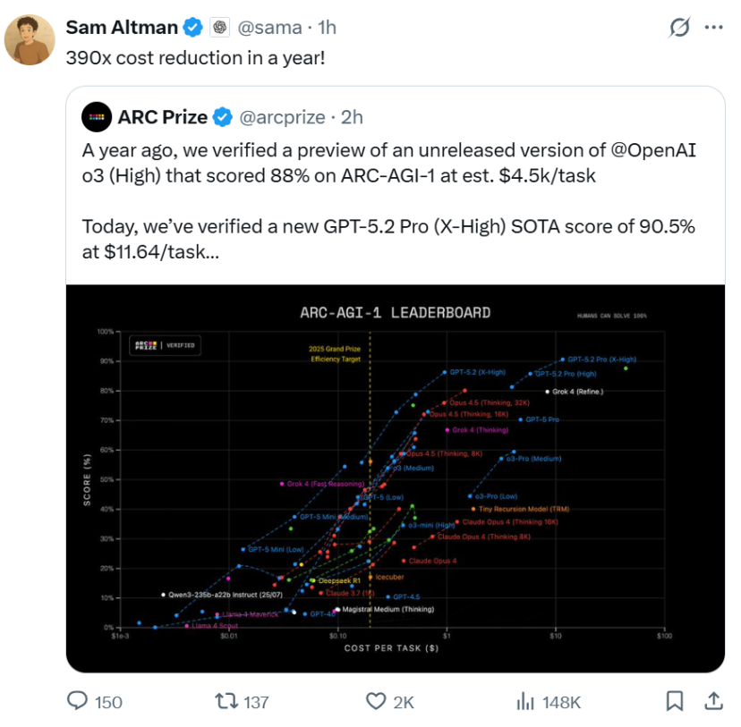 同期这次发布最引东说念主矜重的,不仅是模子自己的技艺提高,更是一个令东说念主诧异的效用数据:在ARC-AGI-1测试中,GPT-5.2 Pro竣事了约390倍的效用转换。