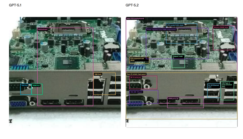 OpenAI展示了一个例子:即使输入一张混沌的主板像片,GPT-5.2也能准确识别出各个组件的位置并标注领域框,而前代模子只可识别出少数部分且位置偏差较大。