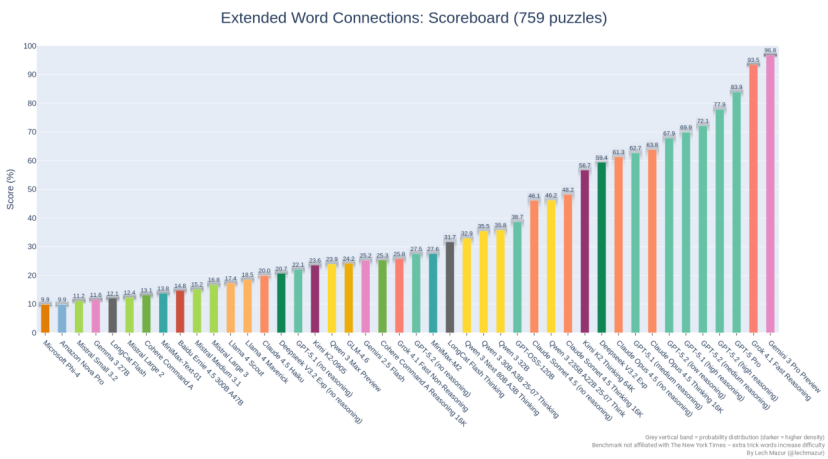 NYT Connections是《纽约时报》推出的一个翰墨游戏,条目玩家从16个词语中找出四组关连的词汇。这个测试被瞎想成了一个LLM基准,通过加入额外的烦闷词来加多难度,目下包含759个谜题。这种测试试验的是模子对言语的幽微长入、空想技艺和分类推理。